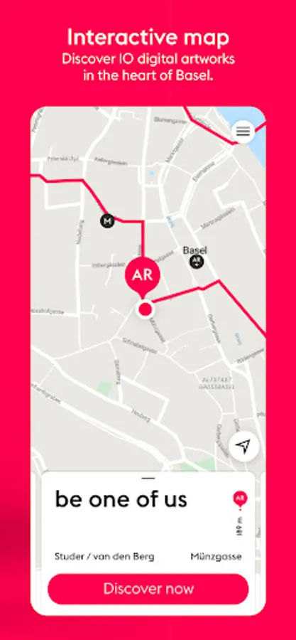 The tour takes you past 10 augmented reality (AR) works of art that can be viewed at different locations in the city of Basel. Use your smartphone and this app for the tour. You should plan around 90 minutes for the whole tour. If you have less time available, you can also visit individual works of art. You can see where the works of art are located on the interactive map here in the app. Once you are there, you can discover the works of art using your smartphone camera.
