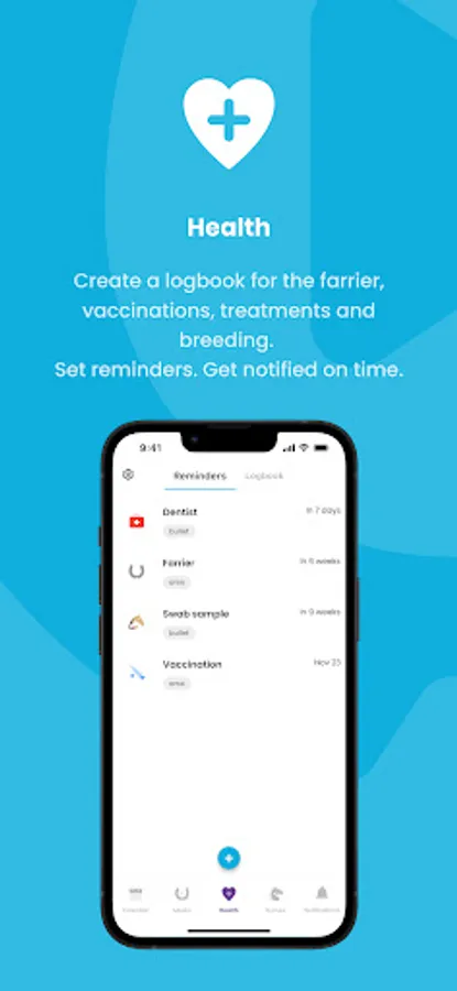 Create a logbook for the farrier, vaccinations, dewormings, treatments and breeding. Set reminders. Get notified on time.