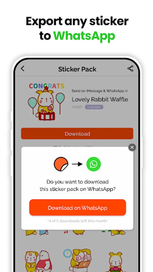Export your favorite stickers to WhatsApp and send them endlessly directly from the app. Blazing fast, easy, and fun.