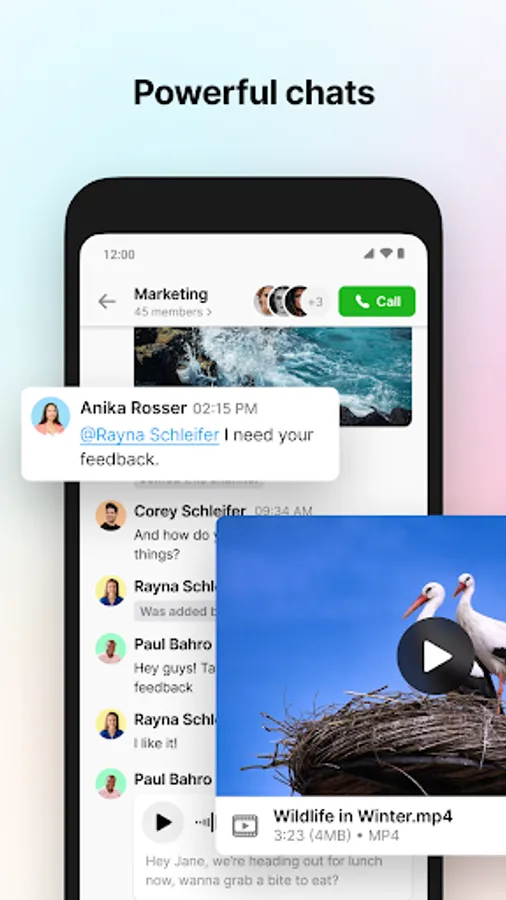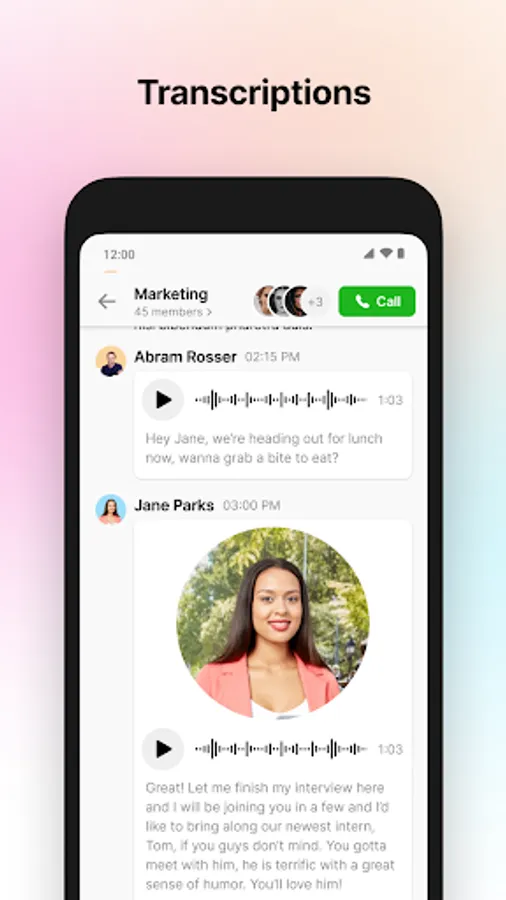 • Time machine for meetings. See and hear team conversing in real time or play back the recording later. Join a live meeting or read the transcription later. All conversations and meetings are recorded automatically.