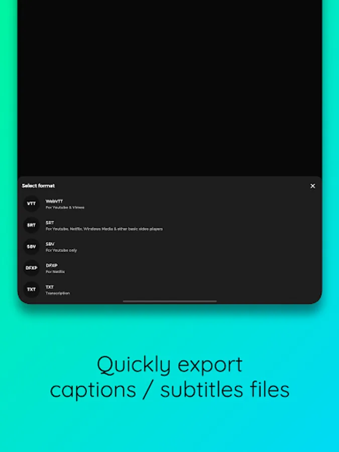 - Quick export to various formats like SRT, VTT, SUB, DFXP & TXT