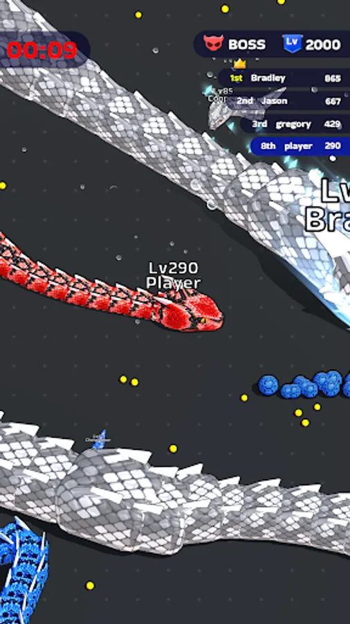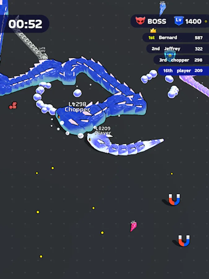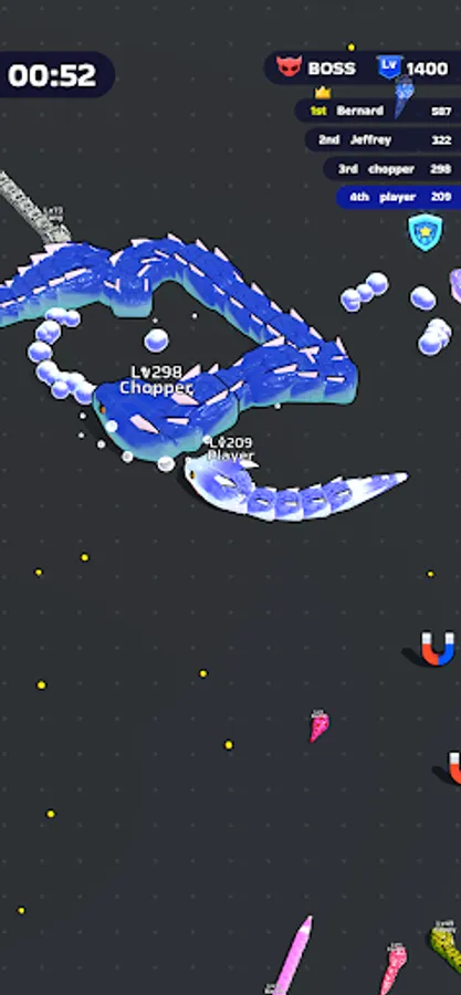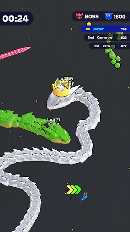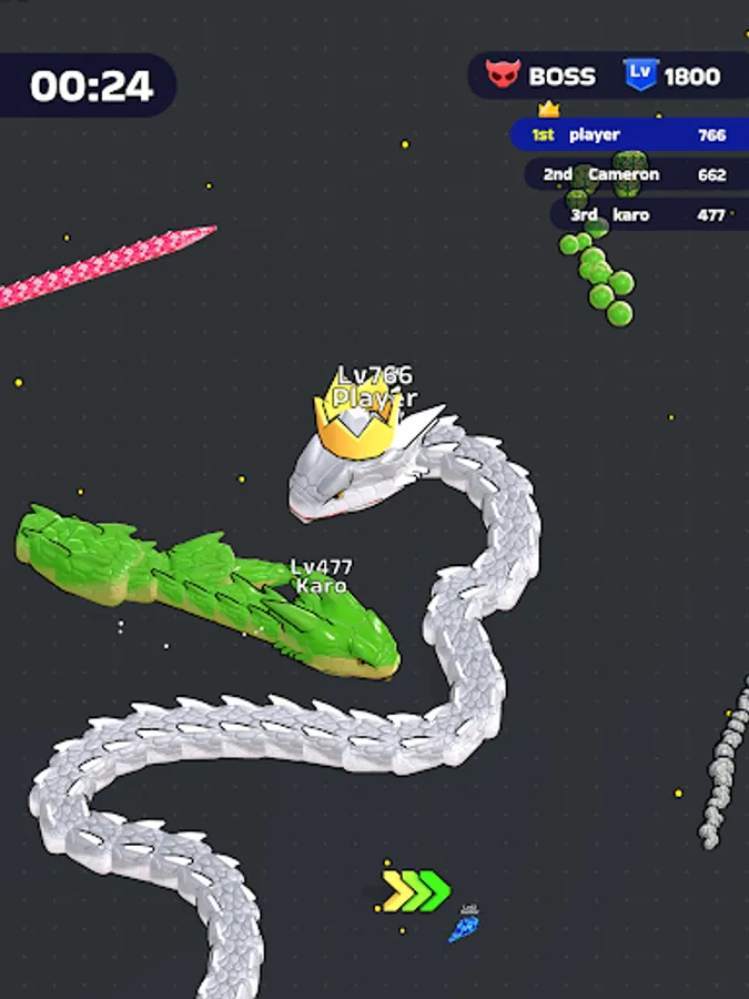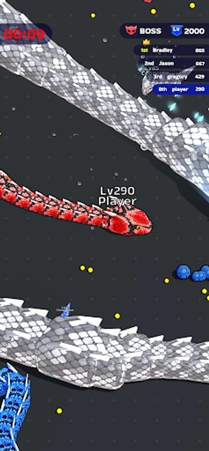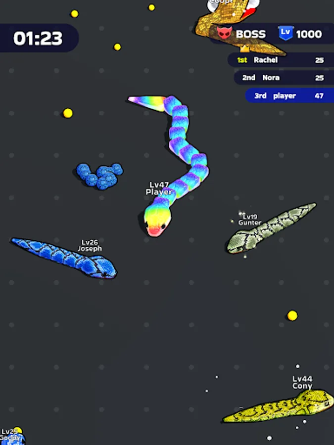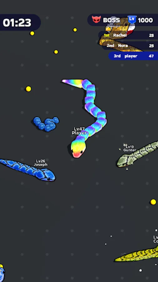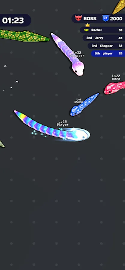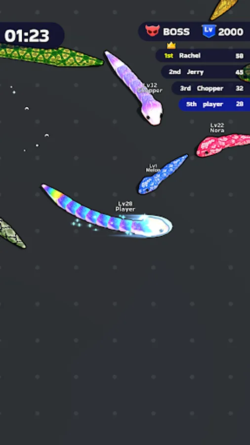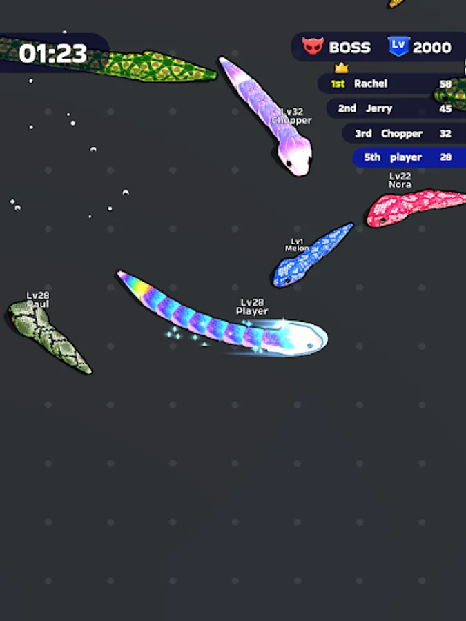 Itβs time to fiercely bump into other players and eat them all! Your goal? Rise to the top by becoming the most powerful snake within the limited time frame. Devour smaller snakes to level up, enhancing your size and strength with each satisfying gulp. The arena is your hunting ground, and every chase is an opportunity to gain an edge over your competitors.