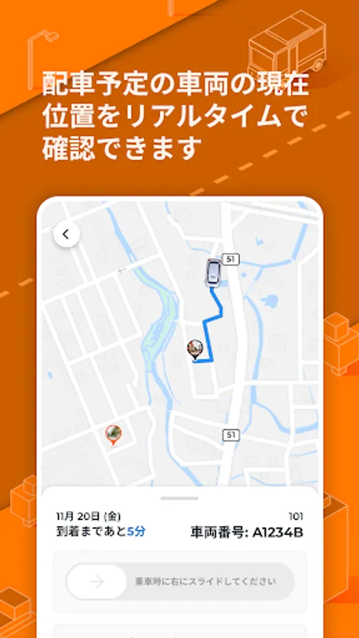 The current location of the vehicle will be displayed on the app. You will be notified when you approach the boarding position, so please wait at the boarding position.