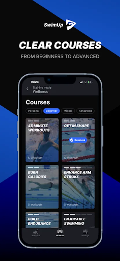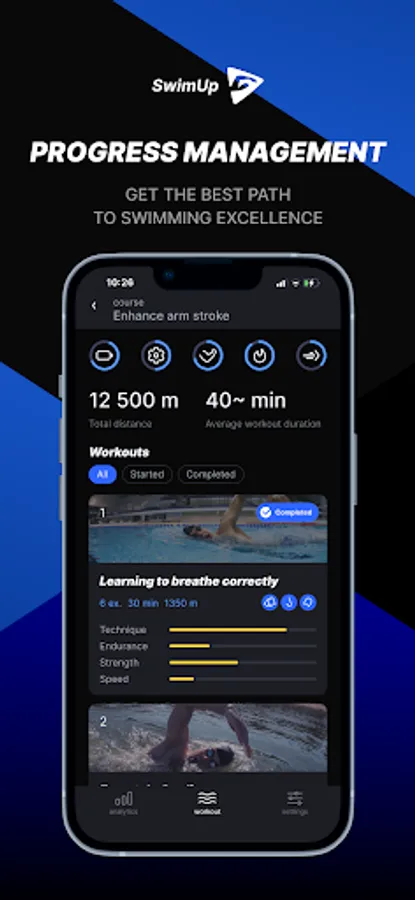 Get the best swimming workout and never have problems with figuring out how to swim! SwimUp provides personal swimming training plans created just for you. Follow your statistics and explore the Theory section to train efficiently and correctly.