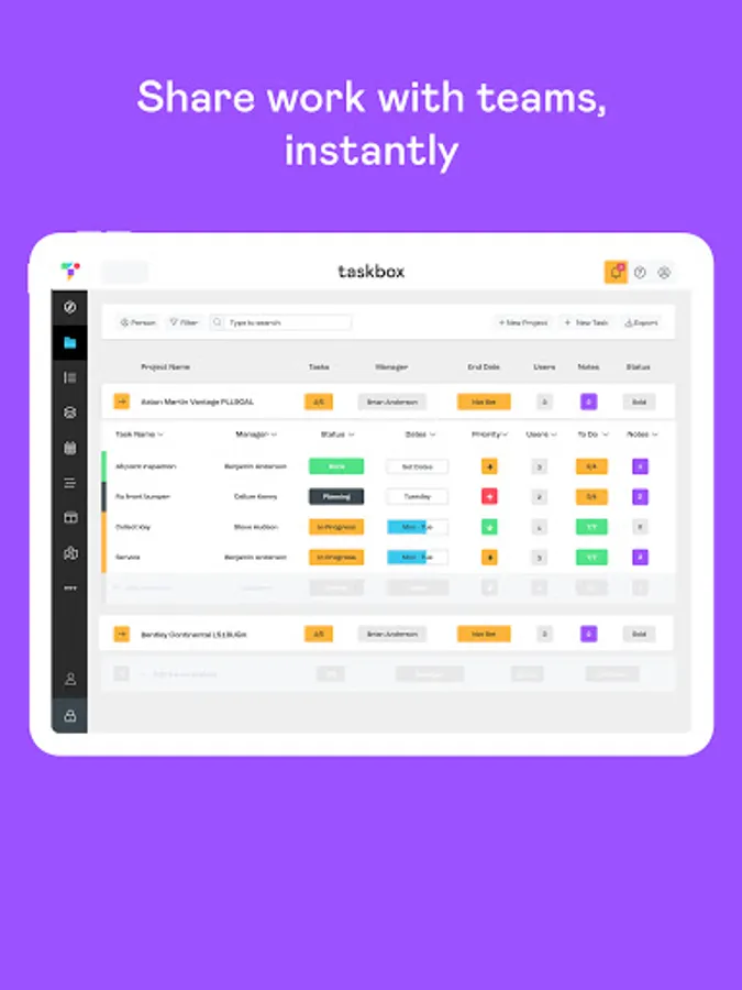 Taskbox provides you with a simple, interactive, and easy to use format that gives you access and visibility of all your ongoing and due work or projects. You can work methodically through this with your team, staying connected and up to date in real-time. Manage work, and projects from one place.