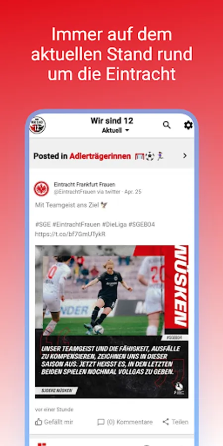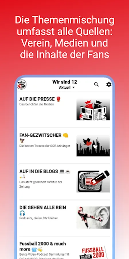 We are 12, the fans come first. Everyone who makes great posts about the SGE in blogs, podcasts or on social media and all other followers who share this content recommend, comment on and like. This content is bundled at Wir sind 12 and supplemented by current reports from the classic media and from Eintracht itself. We are 12 also offers you the opportunity to get in touch with other Eintracht people.