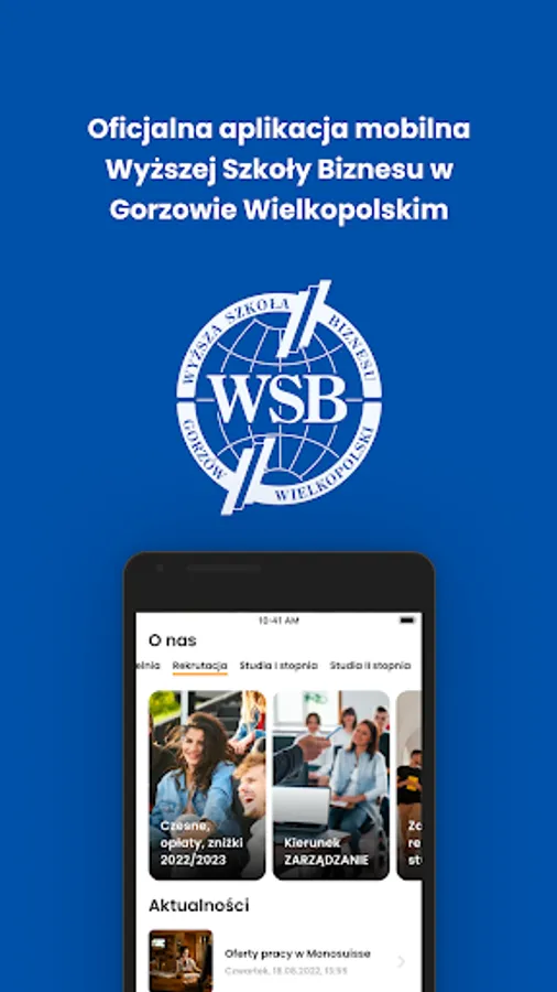 The WSB mobile application is the only official mobile application of the Wyższa Szkoła Biznesu in Gorzów Wielkopolski. The application is intended for both candidates and students of the university. The main purpose of the application is to present users with information content such as: news from the life of the university, articles on the organization of the academic year, messages for candidates and students, schedule for individual years, fields and groups. In addition, the application is also equipped with a dictionary of Polish sign language, which supports the functioning of deaf people and ensures the appropriate level of accessibility of the university.