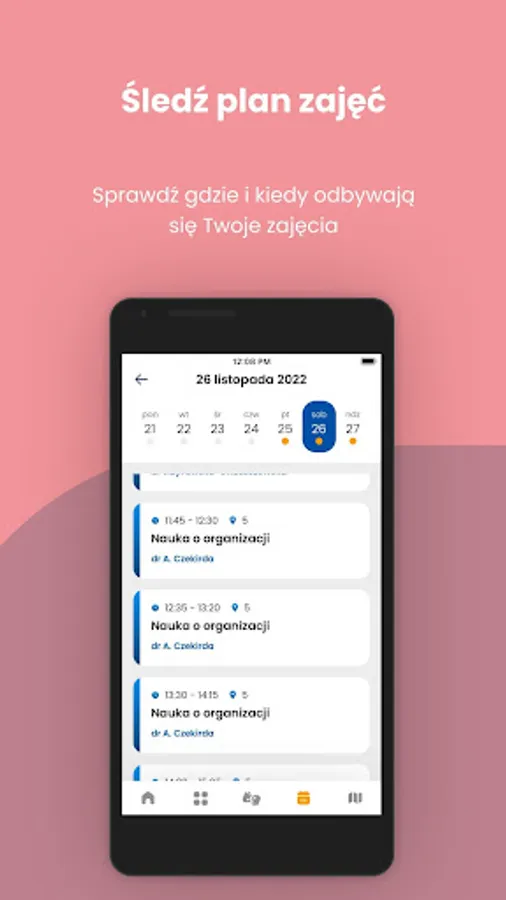 Class schedule - here the student has the opportunity to check the current timetable. Thanks to the synchronization with the base document of the timetable, the data is updated on a regular basis, therefore the timetable will always be up-to-date. The timetable is displayed in the form of a calendar with the dates and times of classes for the appropriate year, field and group group marked in it. In addition, the plan includes information about the planned subject and the name of the lecturer.