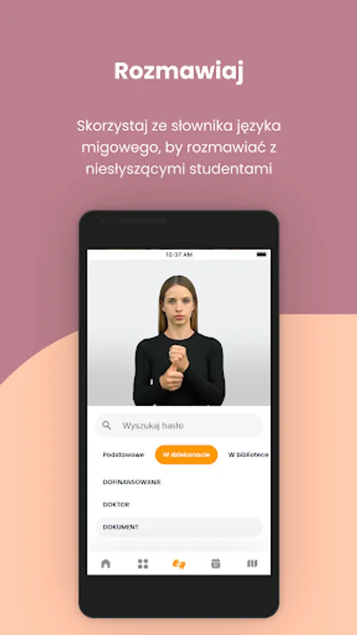 Sign language dictionary - here, both the student and the candidate have the opportunity to familiarize themselves with basic phrases and words in Polish sign language. Each phrase or word is presented as a video. In addition, the module is equipped with a search engine, thanks to which the user can easily search for the phrase he is interested in. The sign language dictionary module can be used both for learning and communication between the hearing person and the deaf person. The dictionary contains words, phrases and phrases that can potentially be used in the context of dealing with university affairs - all of them have been divided into the categories "University", "Dean's office", "At classes", "At the library".