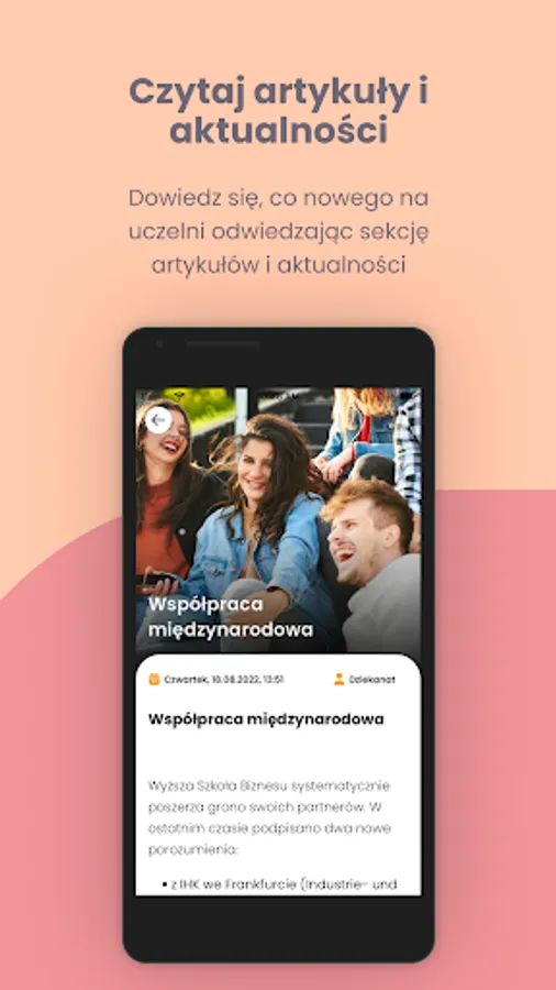 Articles - here the user has the opportunity to read the content presented by the university authorities. As part of the Articles, the application includes, among others, News, Announcements for candidates and students and any other information related to the organization of the university's work and events. The articles are divided into categories that make it easier to navigate through this module.