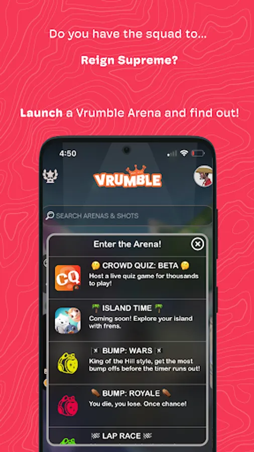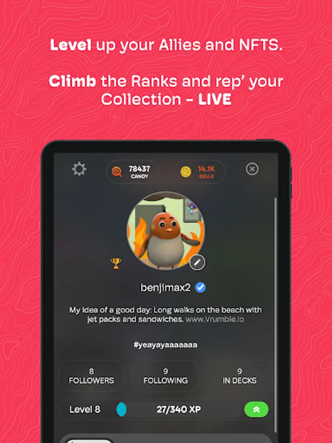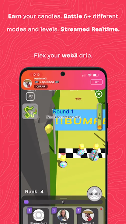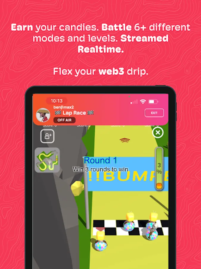 Vrumble is a realtime knockout showdown game with 4-100s of players in each video chat and live-streaming VRUMBLE ARENA. It's like a gameshow with you as the host that lets everyone battle various characters, their web3 NFTs, and more in a set of various ridiculous game modes and levels - casting their MYSTICS to dominate their competitor! Climb the leaderboards and win CANDY!