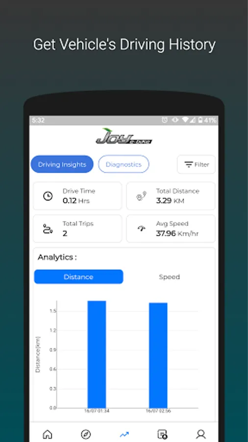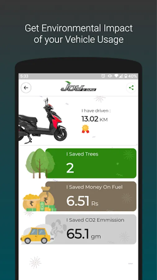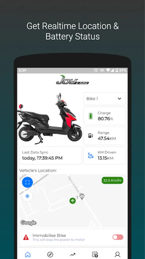 You can stay connected with your Joy E-Bike and manage it. Get realtime location and battery status. You can remotely track, lock/unlock your vehicle. Analyse ride history with statistics, plan your trips for charging requirements. Set customisable geofence and battery alerts to get notified instantly. Get information about positive environmental impact of your vehicle's usage and feel proud to share it within your social media channels.