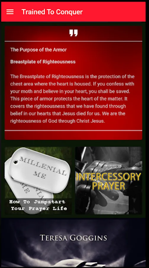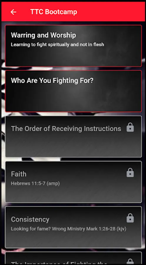 In addition to the bootcamp, you will have access to powerful teachings from Dr. Teresa Goggins, God's general. The goal of this app is to strengthen your prayer life through consistency and building relationship with God. Progress in God's army by staying consistent in your prayer life. For each week that you are consistent, you will increase in rank. Fall short a week and you loose rank. The powerful tools and teachings available to you depend on your rank.