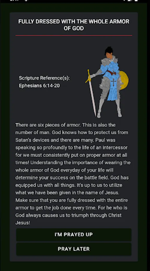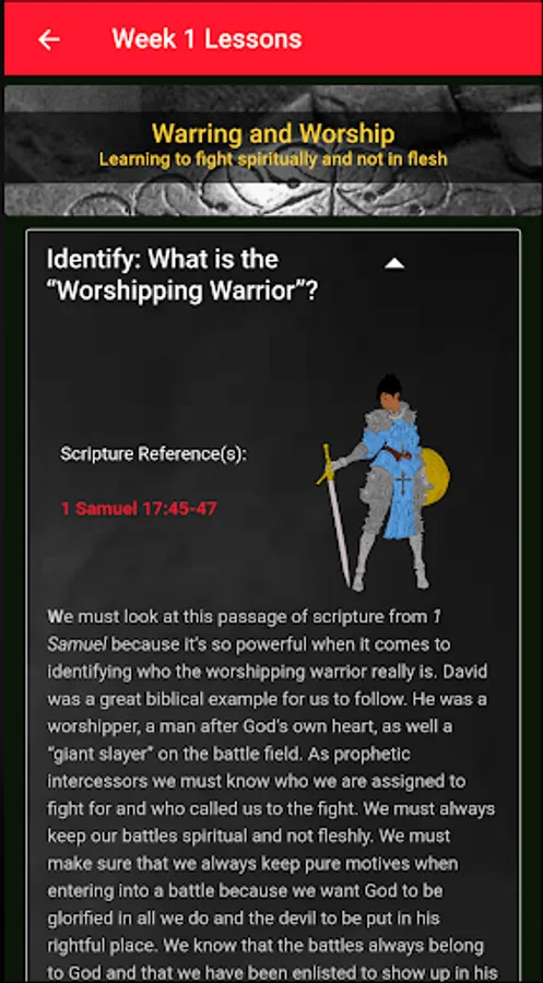 This app will carry you through six weeks of spiritual training as we discover how to take our neighborhoods, schools, and cities back for the glory of God! This six week boot camp will biblically equip and train its users for the seen and unseen battles in the life of believers. It is also designed to assist those that have been called to pray for leadership and visions within the Body of Christ. So brace yourselves and get ready to become a qualified soldier in the army of the Lord!