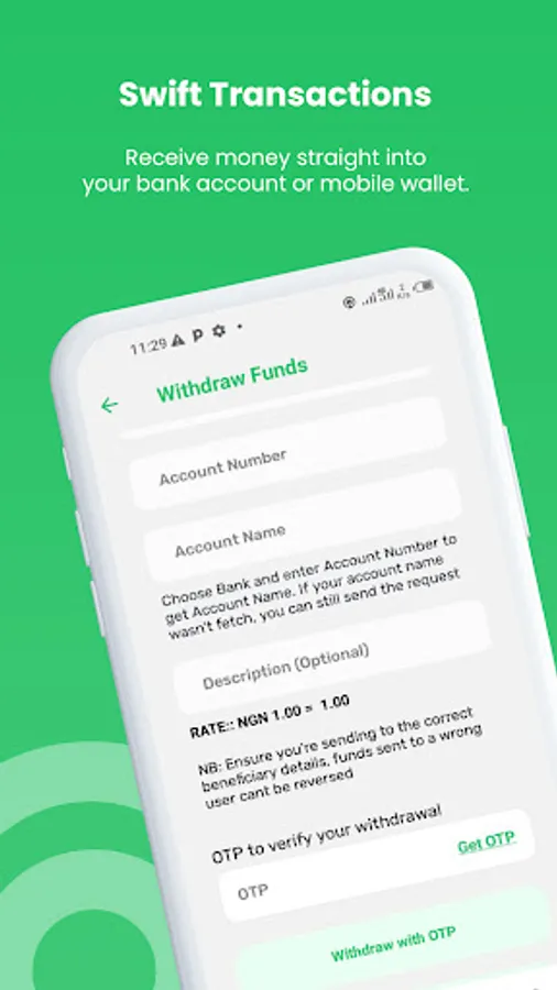 Instant withdrawal through any bank account of your choice, and mobile money wallets or agents: M-Pesa, MTN Mobile Money, Airtel Money, Airteltigo, Vodafone,