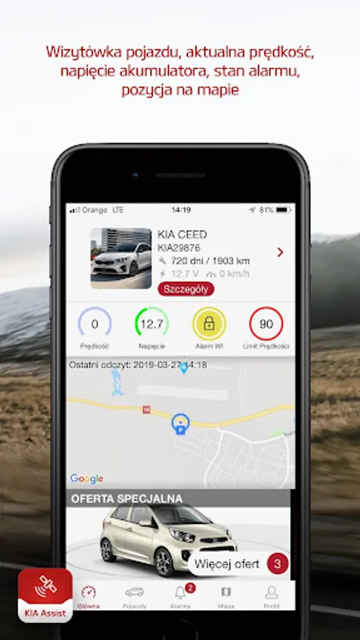 Thanks to our solution, the owner does not have to remember about the technical review of the car - KIA Assist will remind you about the upcoming deadline. The driver also has access to the current location of his car, thanks to which he can easily find him in a large parking lot or in a foreign city. The user also has the option of turning on the ignition lock in his car directly from the application.