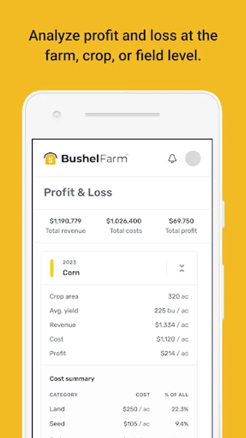 Powerful automation within the tool transforms farm records into valuable insights that farmers can use to plan and make decisions on their own or share with their grain buyers, agronomists, bankers, insurance providers, and other trusted farm partners. Insights include: cost of production; marketing position; profitability of grain sales; and profit and loss at the farm, crop, and field level.