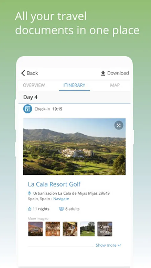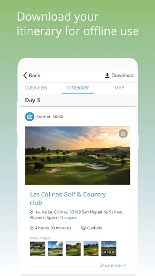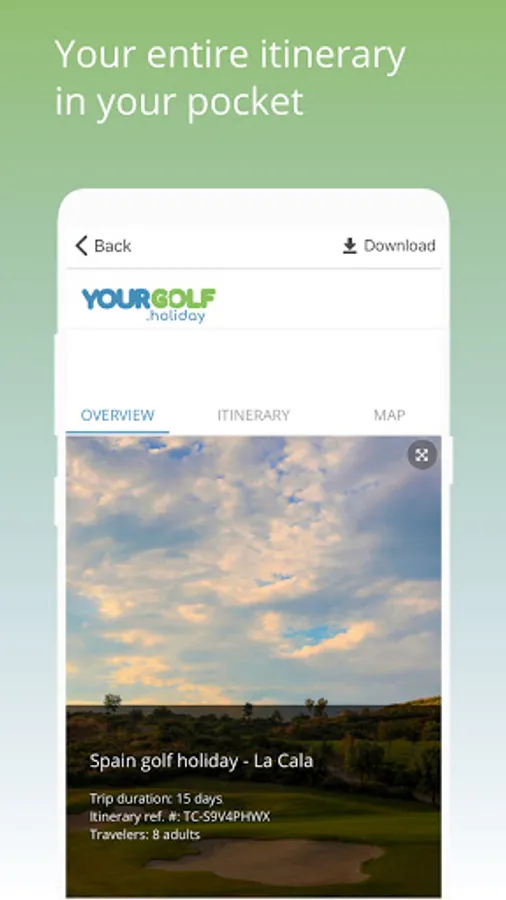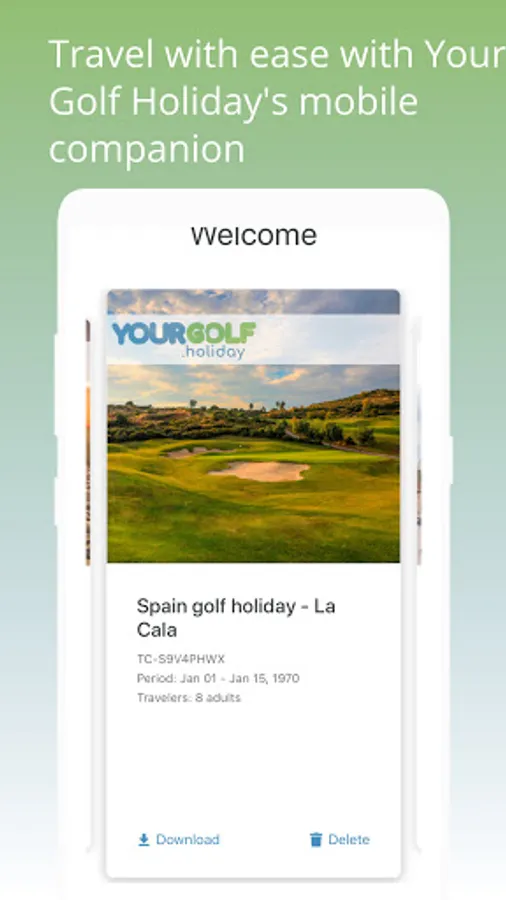 In the Your Golf Holiday you can view all your trips and the details of each one of them, before and during your journey. This App is everything you need: take your travel documents with you, enjoy information and guidance throughout your trip and download your documents for offline use when you have no internet connection