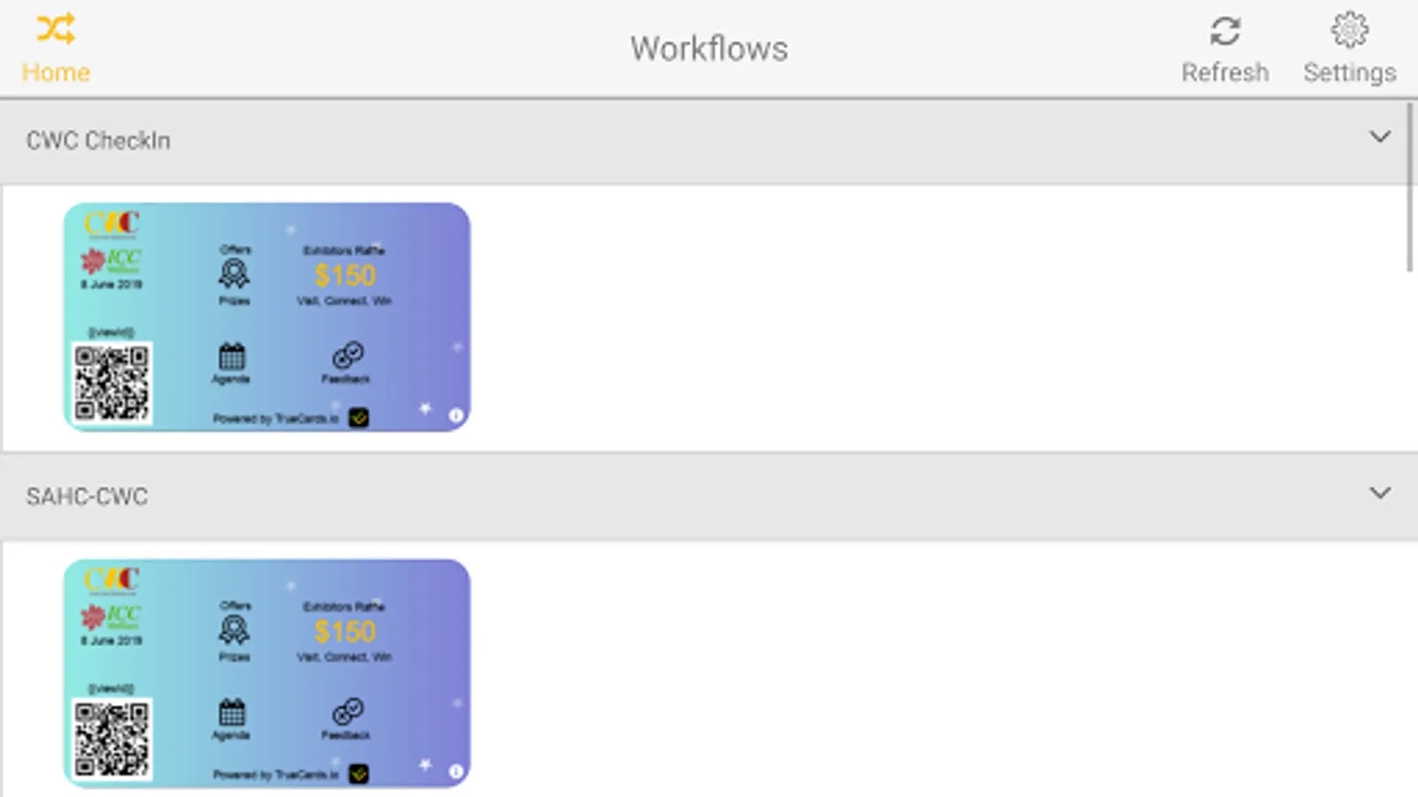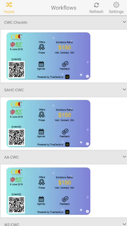 TrueCards Workflows app is for participants in custom workflows involving TrueCards. Typical workflow involves scanning on entering a TrueCard id to retrieve some or all of the information from a card in a verifiable and secure manner. Depending on the rights, participants have access to information and actions. Cards can be sent, resent, and verified using the Workflows app.