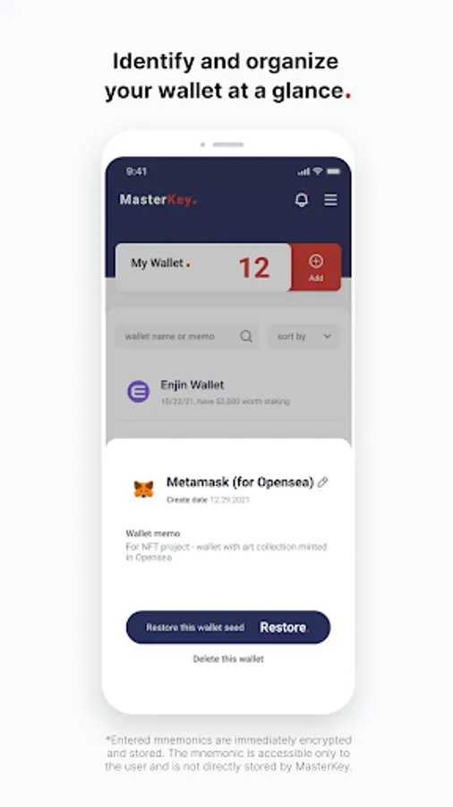 Upgraded from the existing Master Key 1.0 version, MasterKey 2.0 version has been released. In MasterKey 2.0, private key storage and recovery processes are all free of charge with no limit in numbers. In addition, a custom memo function for each wallet has been added, enabling more detailed wallet management.