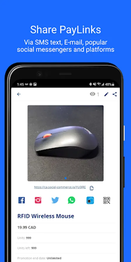 Send paylinks to customers in multiple ways to collect payment including Email, SMS text and many popular social messaging apps natively installed on your mobile device, like Whatsapp, Facebook and Instagram messenger, SnapChat, WeChat, you name it!