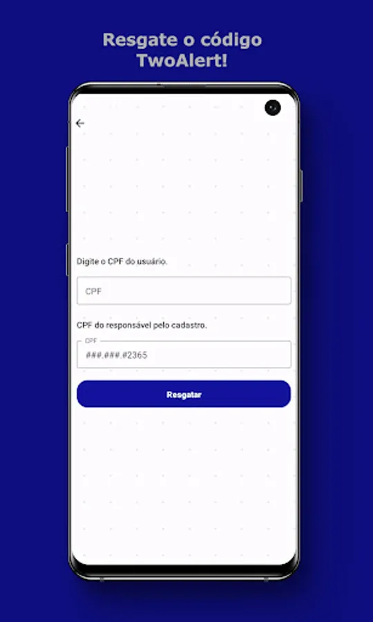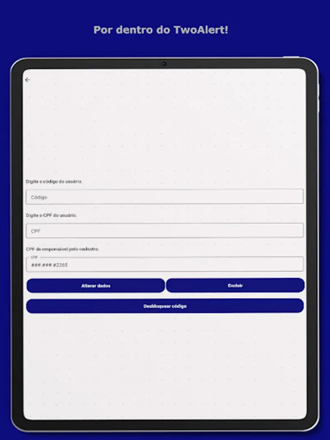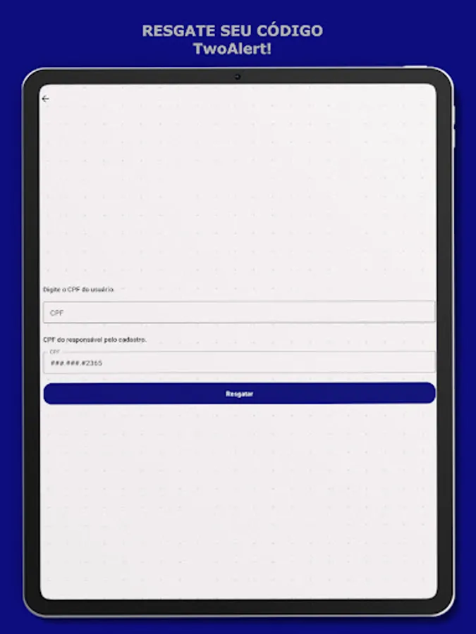 Register - Here, the user's registration is completed and someone else in the family fills it out, such as mother, brother, uncle, cousin, etc... Name, age, marital status, sex and gender are requested, nationality, photo and CPF. All data, with the exception of the CPF, which cannot be viewed by third parties, can be shared with the user's authorization. For security reasons, the photo must always be taken with the person who made the registration and must not be used on social networks, only when requested by someone through TwoAlert.
