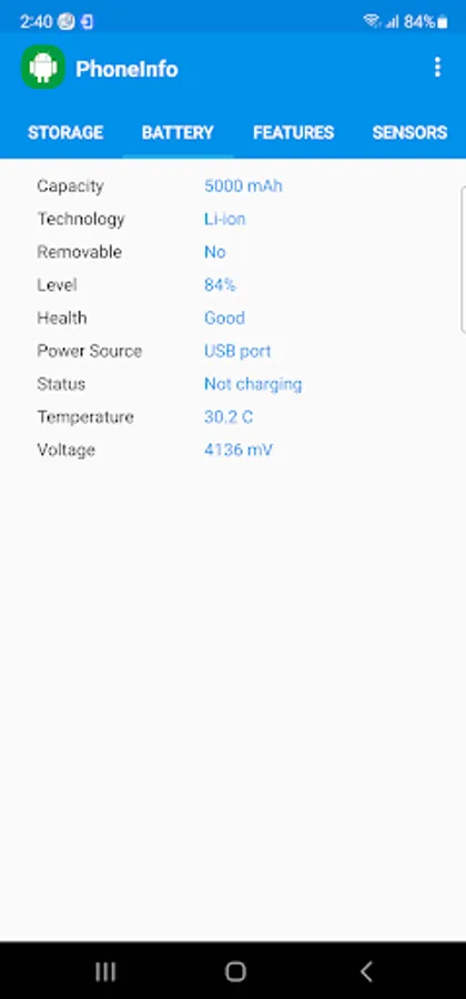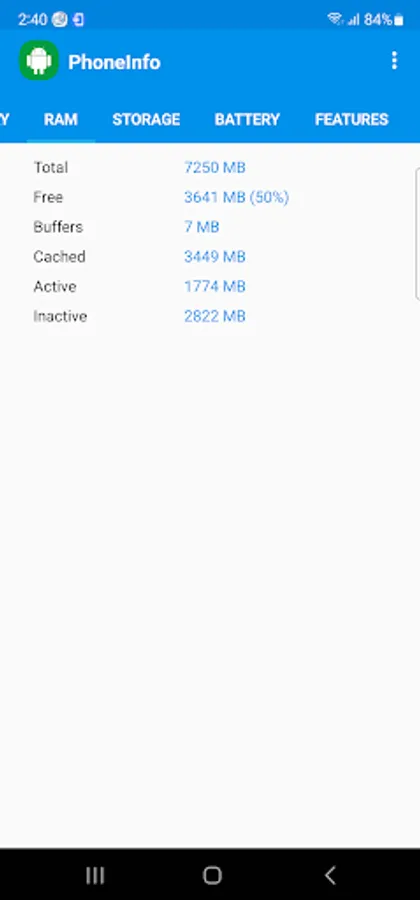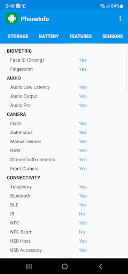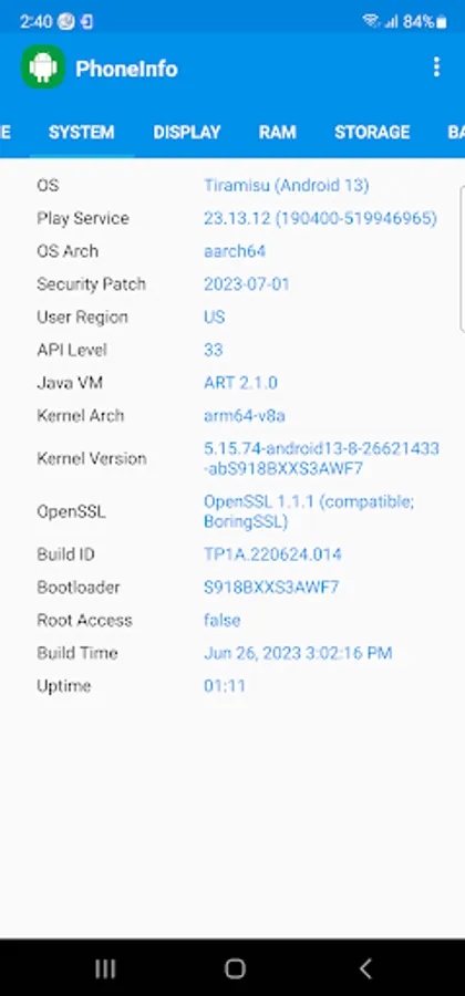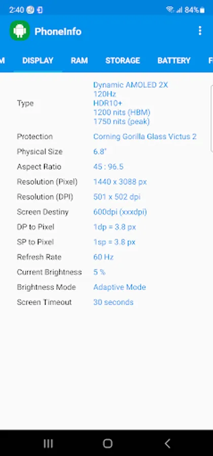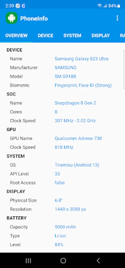 - System information, which includes device brand and model, screen resolution, RAM, and storage capacity.