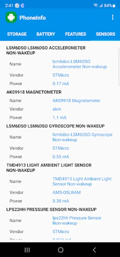 - Detailed sensor information, including sensor names, manufacturer, and power usage