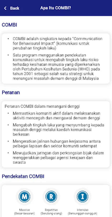 An application developed to support the implementation of the COMBI program in an effort to ensure that the community is always active in carrying out Dengue prevention and control activities.