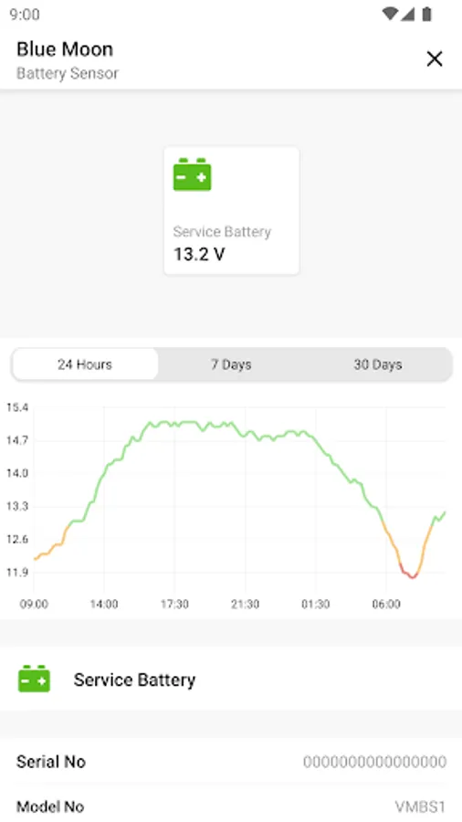 Vanemar Battery Sensors constantly monitor the connected battery or battery groups and alert you if the voltage gets low. You can also browse your battery's voltage history.