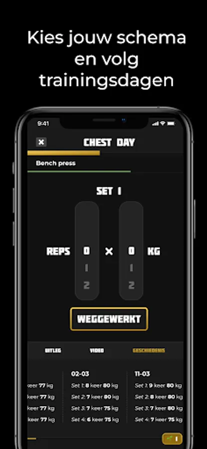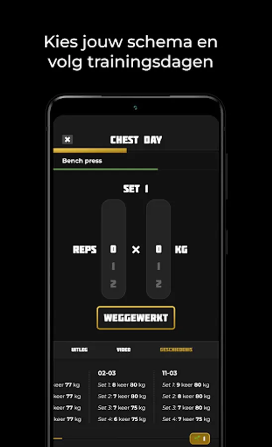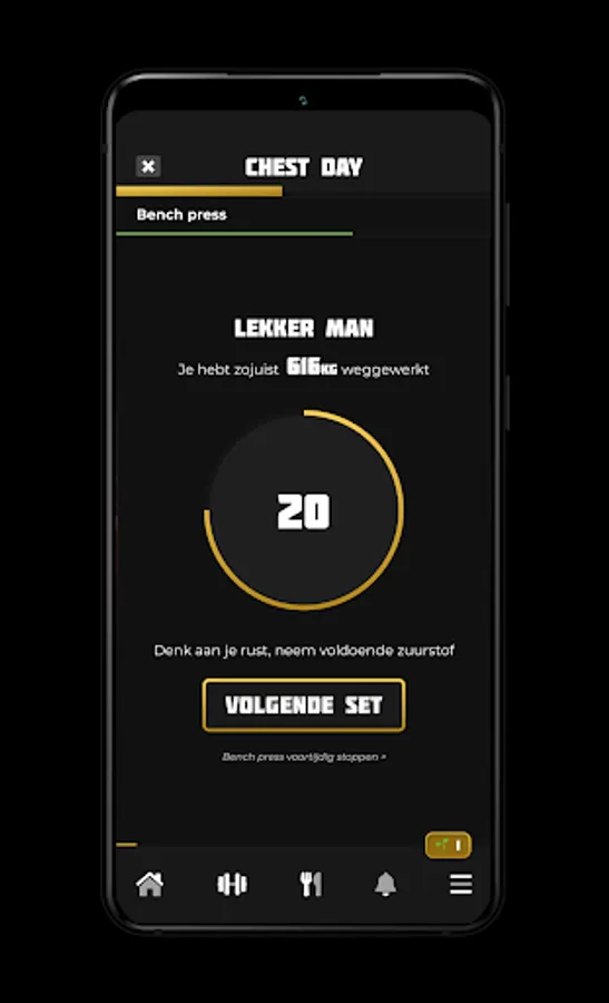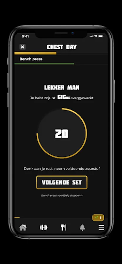 During your training, the App keeps track of how many sets, reps and kilos you get rid of!