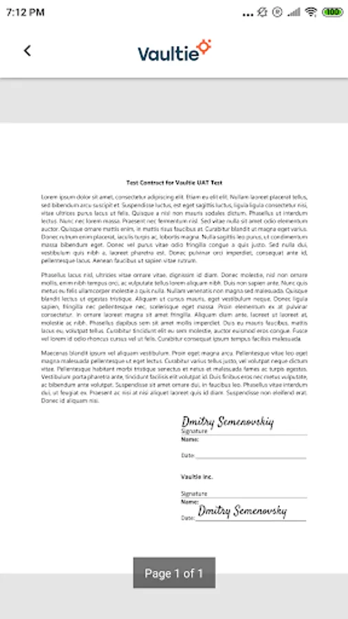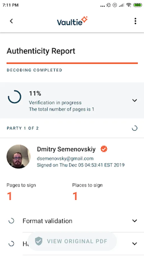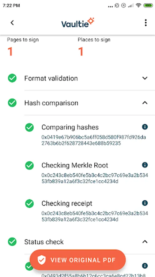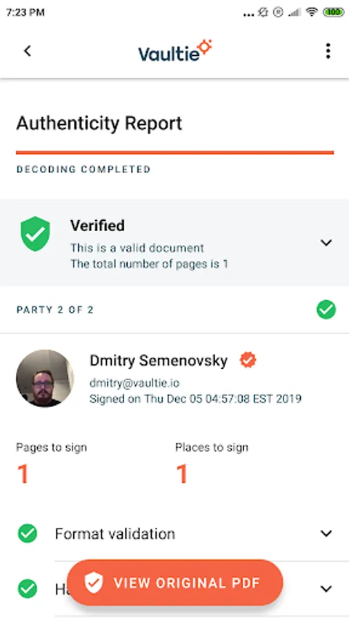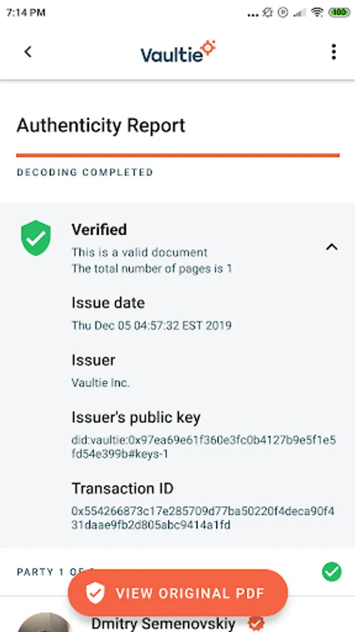 Vaultie lets you verify signed documents in an instant. Just point your camera towards the QR code on the bottom of a Vaultie-signed document and you'll get a report containing selfies of the signatories, cryptographic proof, Blockchain references, and even the original copy of a printed document.