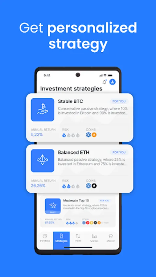 It is not easy to figure out which cryptocurrency to buy, what is a good entry price, and when is the right moment to sell. No need to worry, with Veli strategies, you can take advantage of long-term trends and invest like the smartest investors, automatically. All strategies have been developed and backtested for performance by a team of PhDs in quantitative finance. The goal is to buy in the bear market and sell in the bull run.