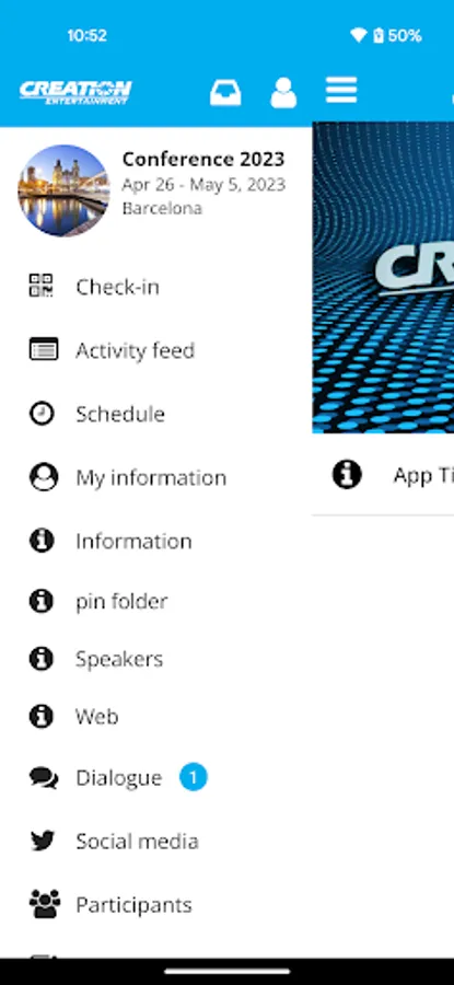 This is our event app. It will be used for showing the agenda, speakers and other practical information about the event. In the app you will be able to answer polling questions as well as asking questions to the stage.