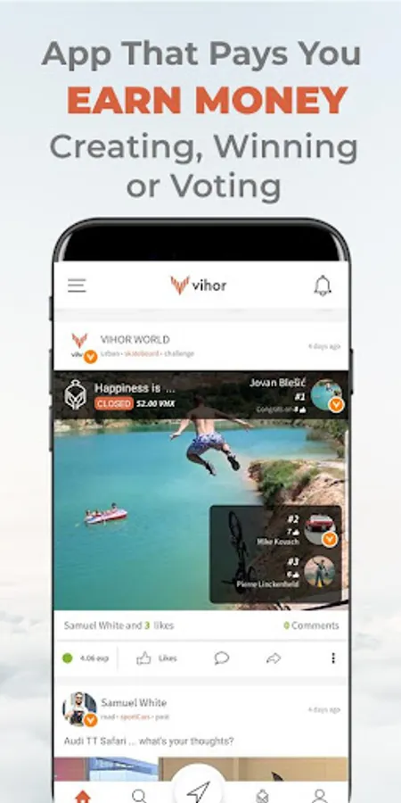 VIHOR is the only sports action app that pays you for liking, commenting or voting in Photo and Video Challenged.