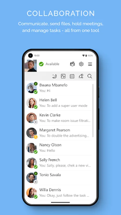 Mobile Virola Messenger provides the same functions as the desktop one.
