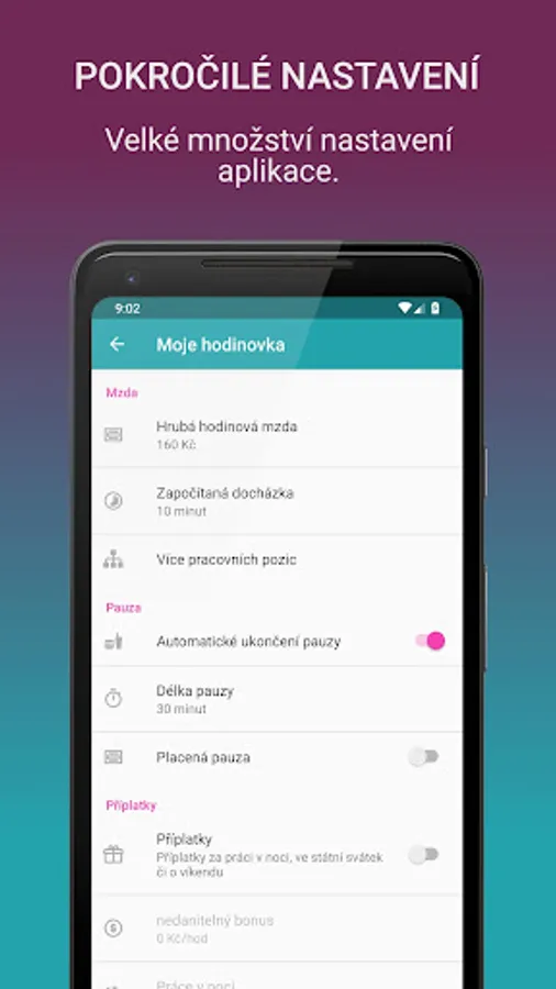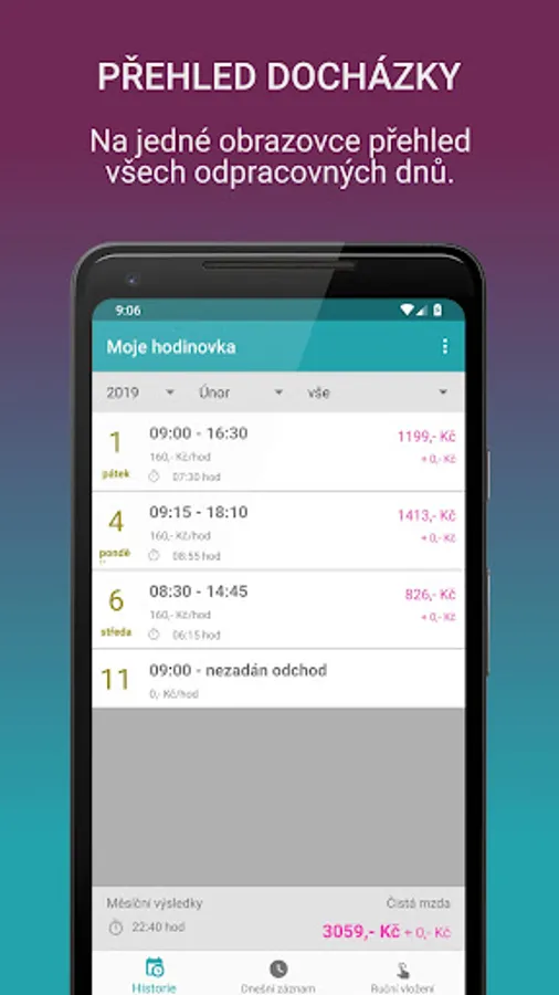 A simple app for your attendance, where you are tracking your working hours. This is not an attendance system or a classic job report, but the app will help you keep track of your personal attendance , and if you set the hourly wage to see how much you've earned. You can set bonuses / weekend bonuses / night and a non-taxable bonus ( eg a post on that clean uniform ).