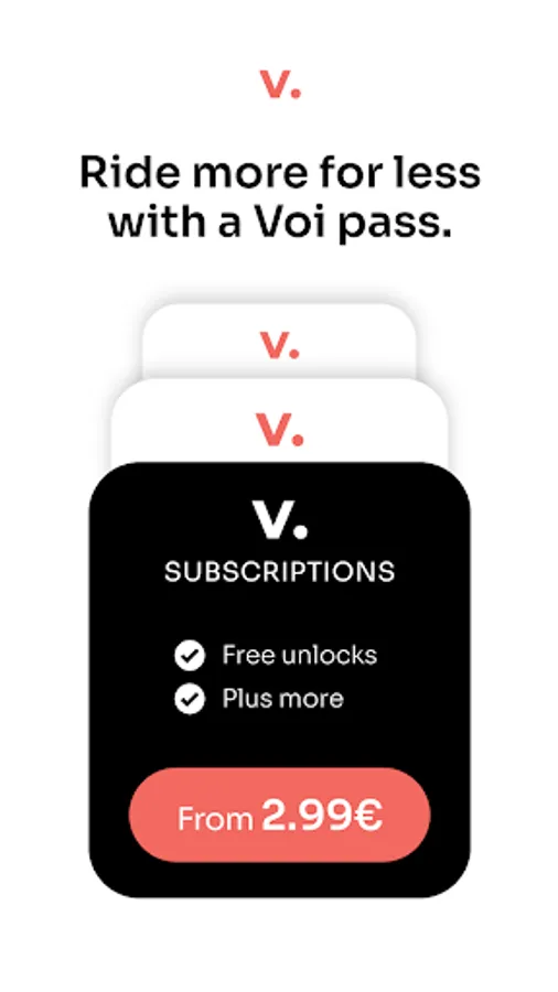 Pay per ride or get a Voi Pass and enjoy 45-minute rides for either 24 hours, 30 days or even longer. Exact prices vary between cities and may be subject to change. See current prices in your area by signing in to the Voi app.