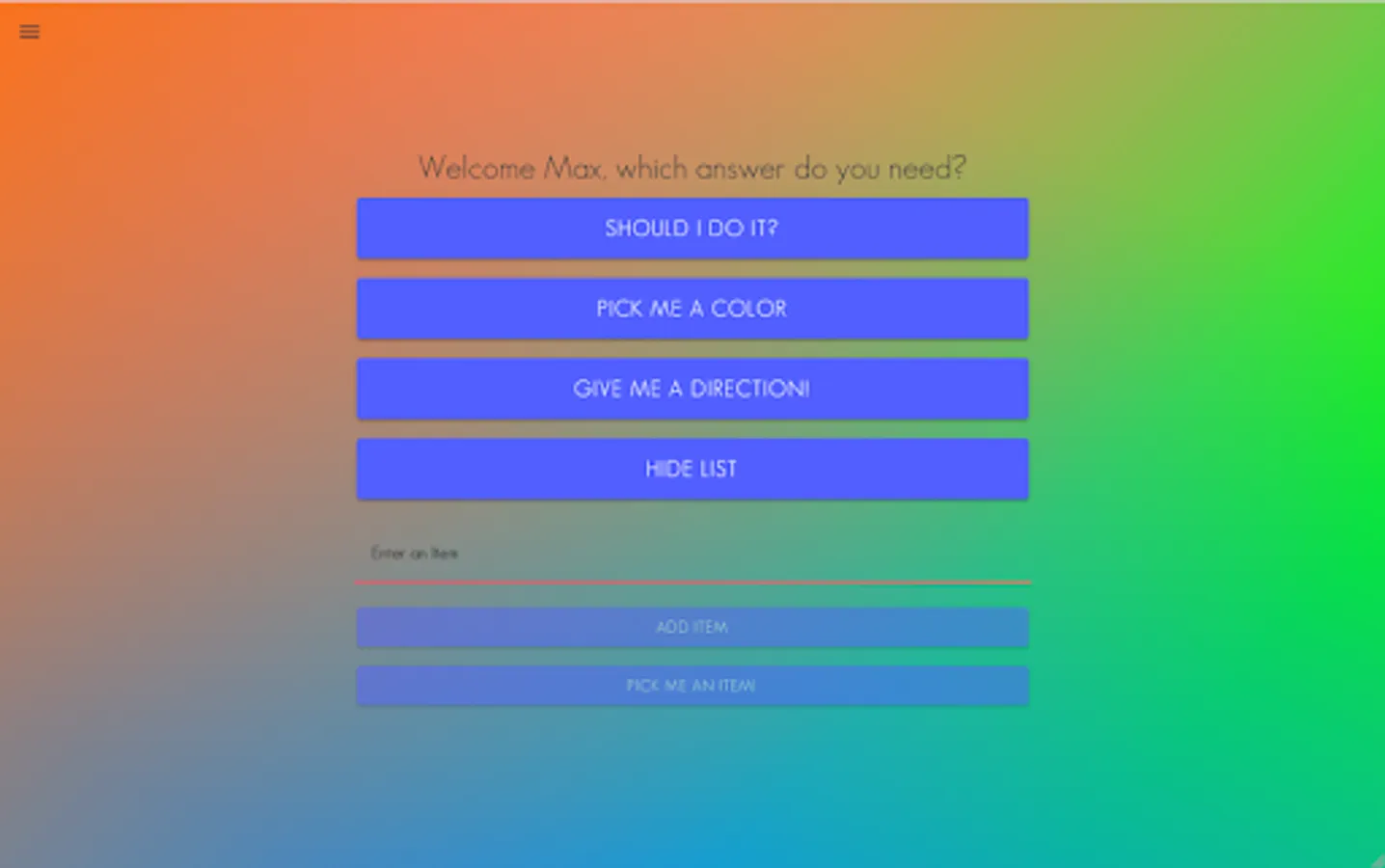If you can't decide between different things, just create a list with them, Decidio will choose an element from it! So you don't need to worry your head anymore :)