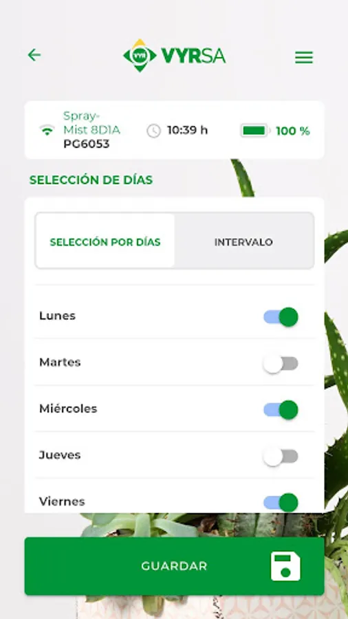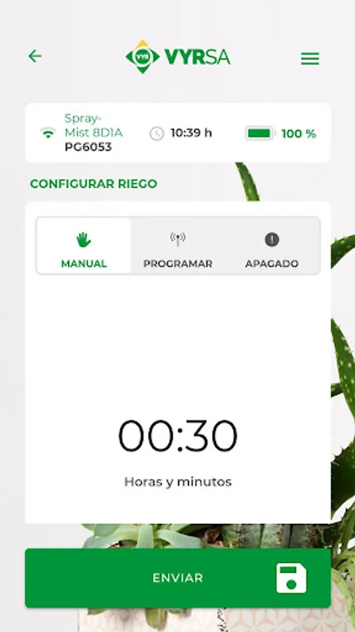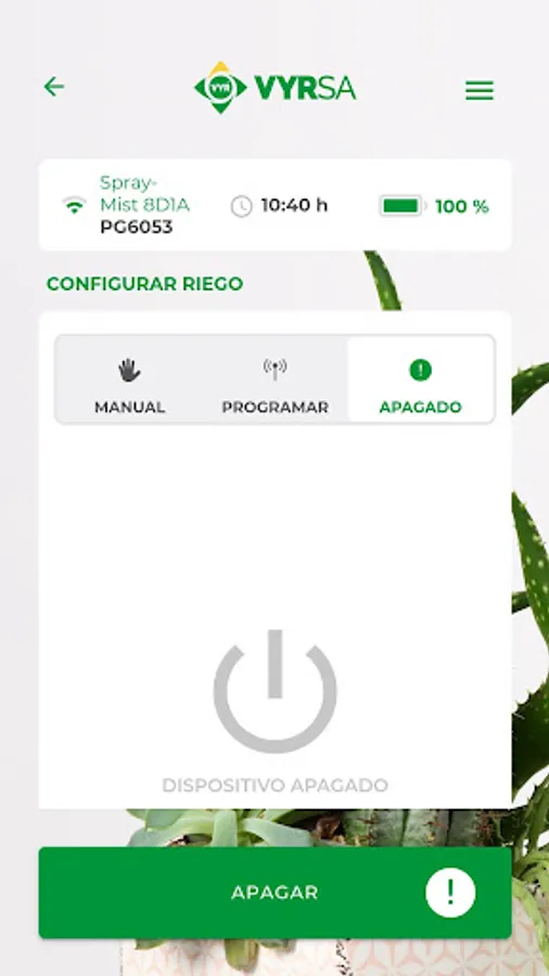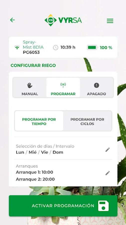 VYR_BT allows you to connect with your PG 6053 and PG6060 irrigation controller to configure your irrigation hours easily and easily in a few steps.