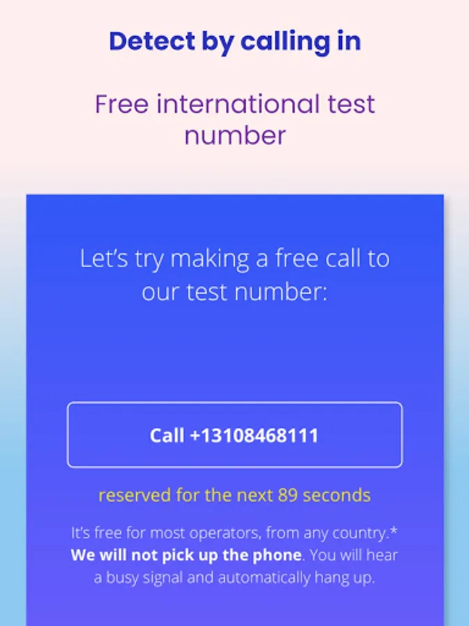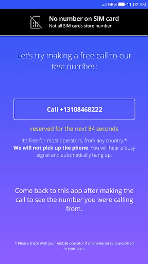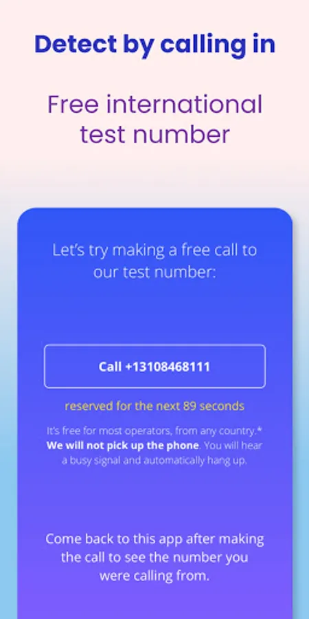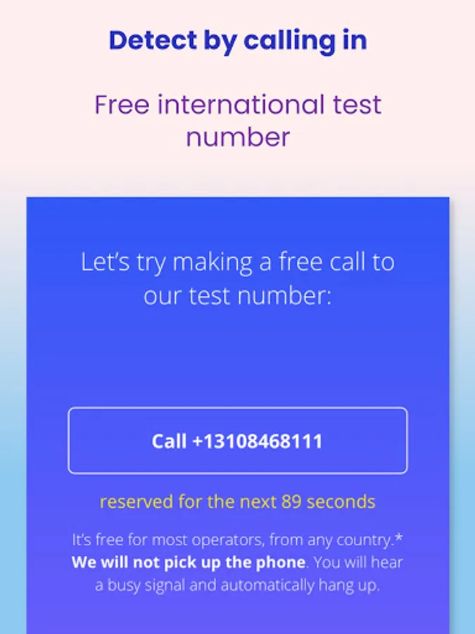WhatIsMyNumber.io is a free app for Android and the web that will find your mobile number in seconds whenever you have a question “What is my phone number”. Just install the app on your device and tap "Detect Now" to get started. The My Number app will scan your SIM card and show you your phone number. If the phone number is not written on your SIM card, the app will give a free number you can call to detect your number using caller ID and display your phone number inside the app after you hang up.