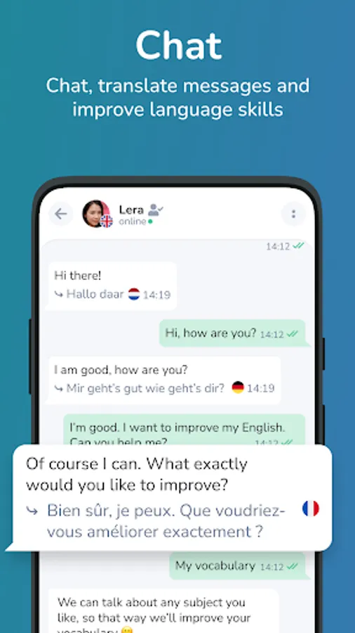Chat with native speakers and translate their messages into your native language. Correct your messages in case of errors or typos