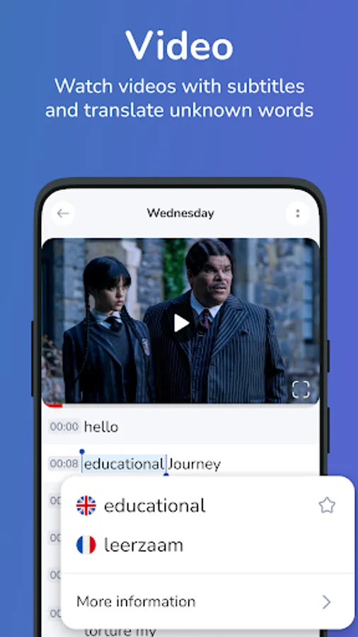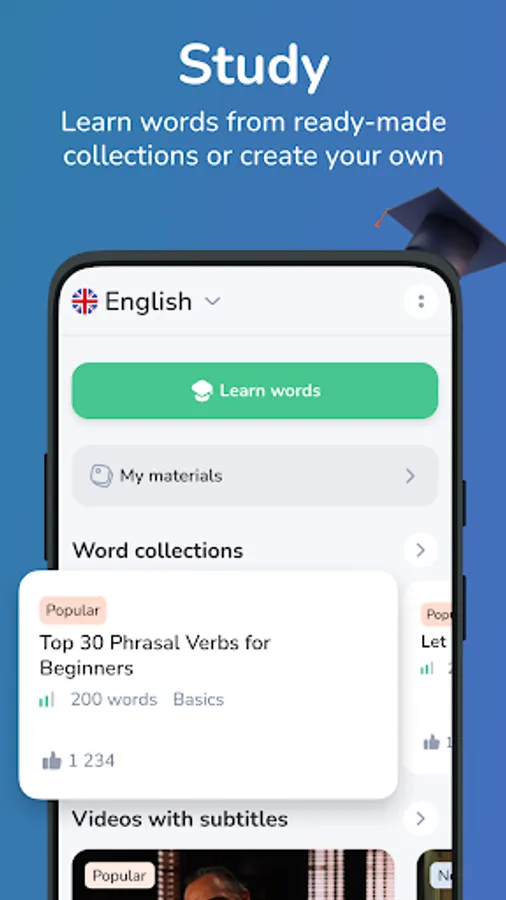 Learn new words with collections and subtitled videos on different topics and difficulty levels