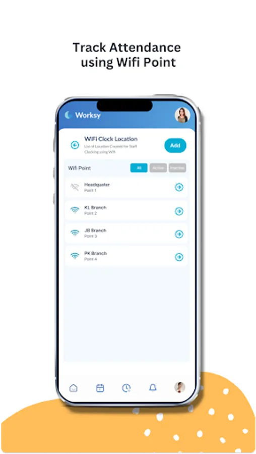 Wifi Point Clocking: Ensure employees are at the right place. With Wifi Point Clocking, employees can only clock in when connected to the designated workplace Wifi, ensuring authenticity.
