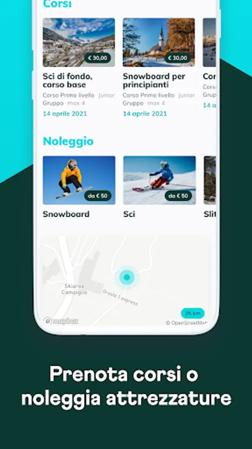 Book courses and rentals. Enter the profile of the school, read the descriptions of the courses, what type of equipment or outfit they have available, information on their services. Then you just need a tap to book the lessons or the rental of the equipment you need directly from them, just when you need it. So you arrive light in the commercial.