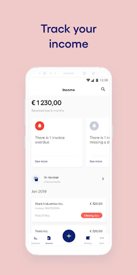 You’ll be able to see an overview of your income transactions, invoices and missing documents. Upcoming versions of the app will allow you to create invoices and send out reminders for them as well.