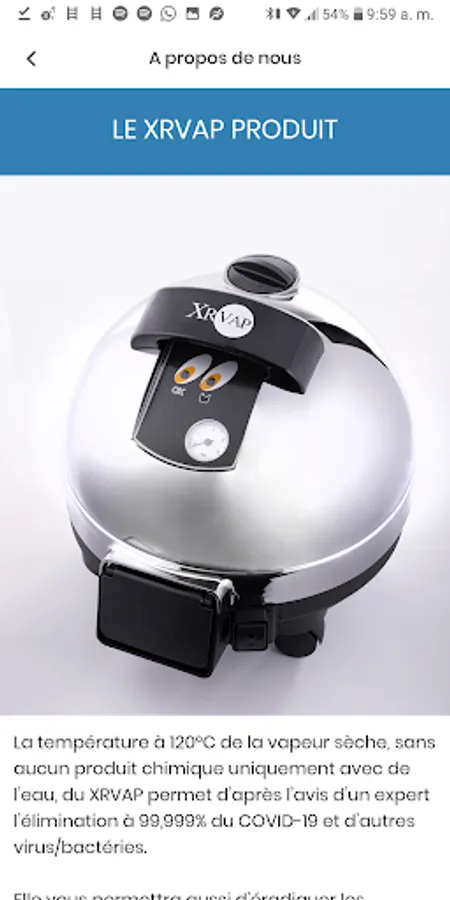 The XRVAP, a unique product that allows you to clean, disinfect and degrease your entire house with water only. The high temperature reached by the XRVAP (120°C) at the outlet of the accessory, allows an optimal result and, according to an expert opinion, the elimination of 99.999% of COVID-19 and other viruses/bacteria. The dry steam is ideal for daily use on all types of surfaces such as floors, windows, kitchen, bathroom, clothes, shoes, cars, boats etc...The XRVAP is present in different sectors such as medical, educational, hotel, watchmaking and many others.