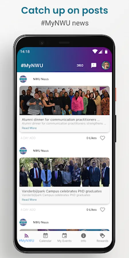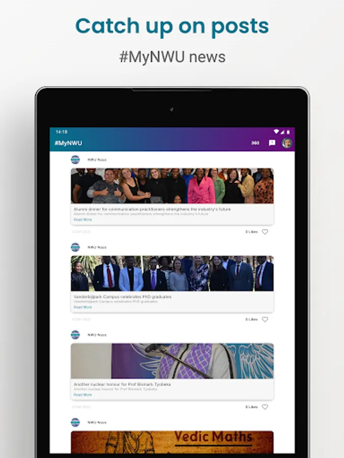The #MyNWU app is the new communications platform of the NWU. Stay up to date with the latest news and events at the North West University. Information is relevant to your context and there is something for everyone.
