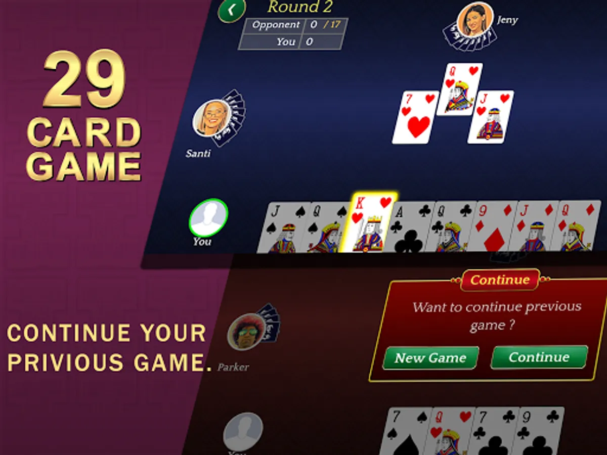29 is a trick-taking card game played among four players in 2 teams. Two players facing each other groups up to win tricks with the highest rank cards. The turn changes in an anti-clockwise direction where each player has to places a bid. The player with the highest bid is the Bid Winner; they can decide the trump suit. If the bid winner team wins that round, they get 1 point, and if they lose they get a negative 1 point. The 6 of Hearts or Diamonds indicate a positive score, and 6 of Spades or Clubs indicate a negative score. A team wins when they score 6 points, or when the opponent scores negative 6 points.