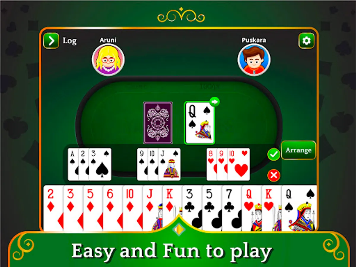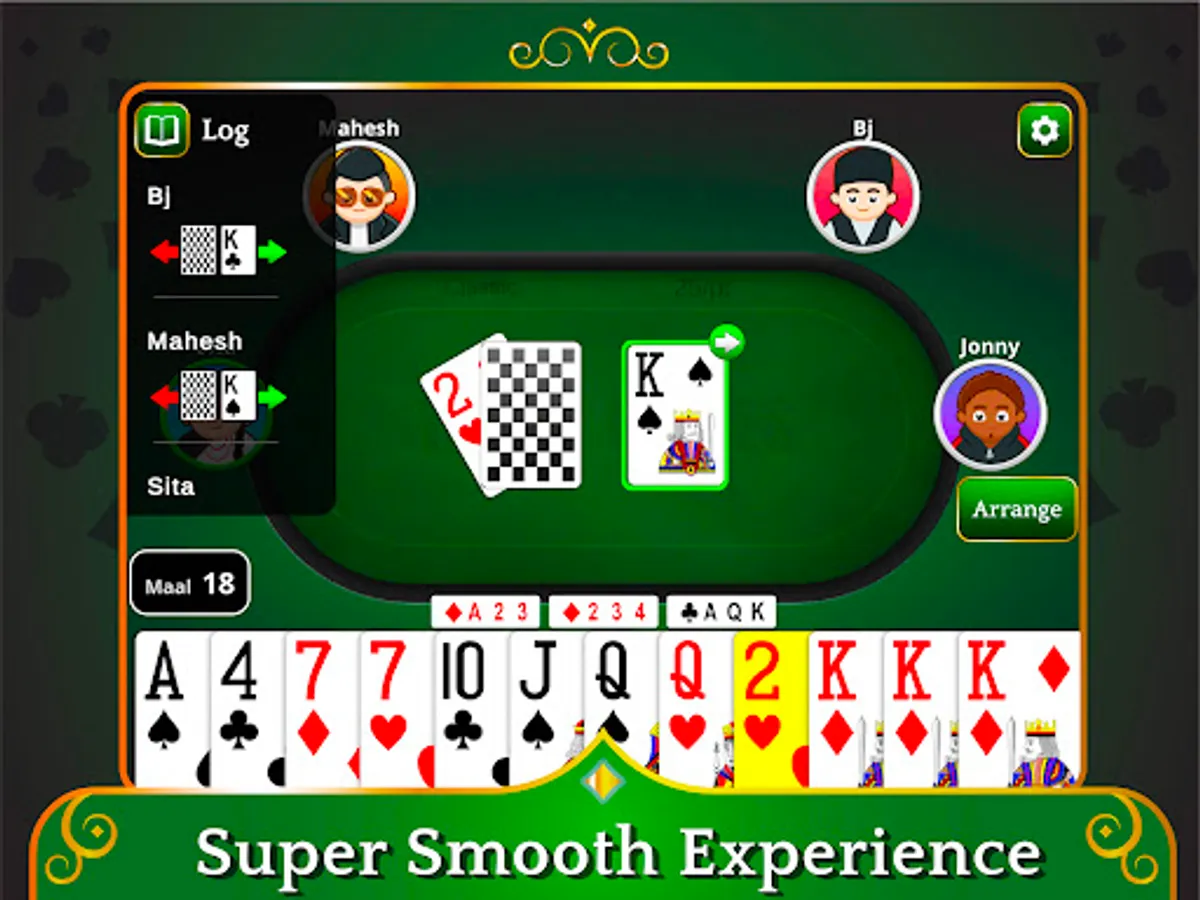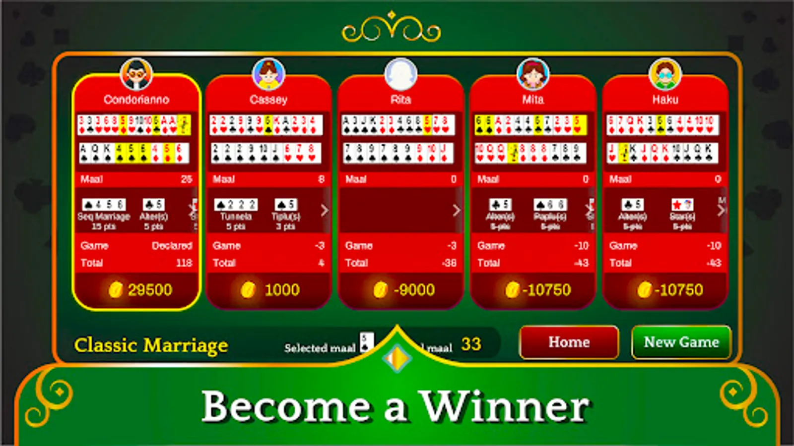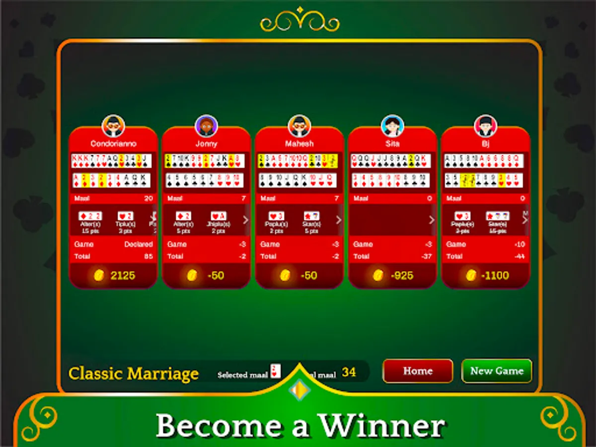 Unlike like the Indian rummy variant, the person who declares the game doesn't necessarily win the game. The rules of winning are a bit closer to that of Nepalese variant. The game automatically calculates the points for each player based on the value of Maal the player holds, and the number and values of unarranged cards in hand. Calculating the points manually is pretty hards, so the beginners are intimidated by it.